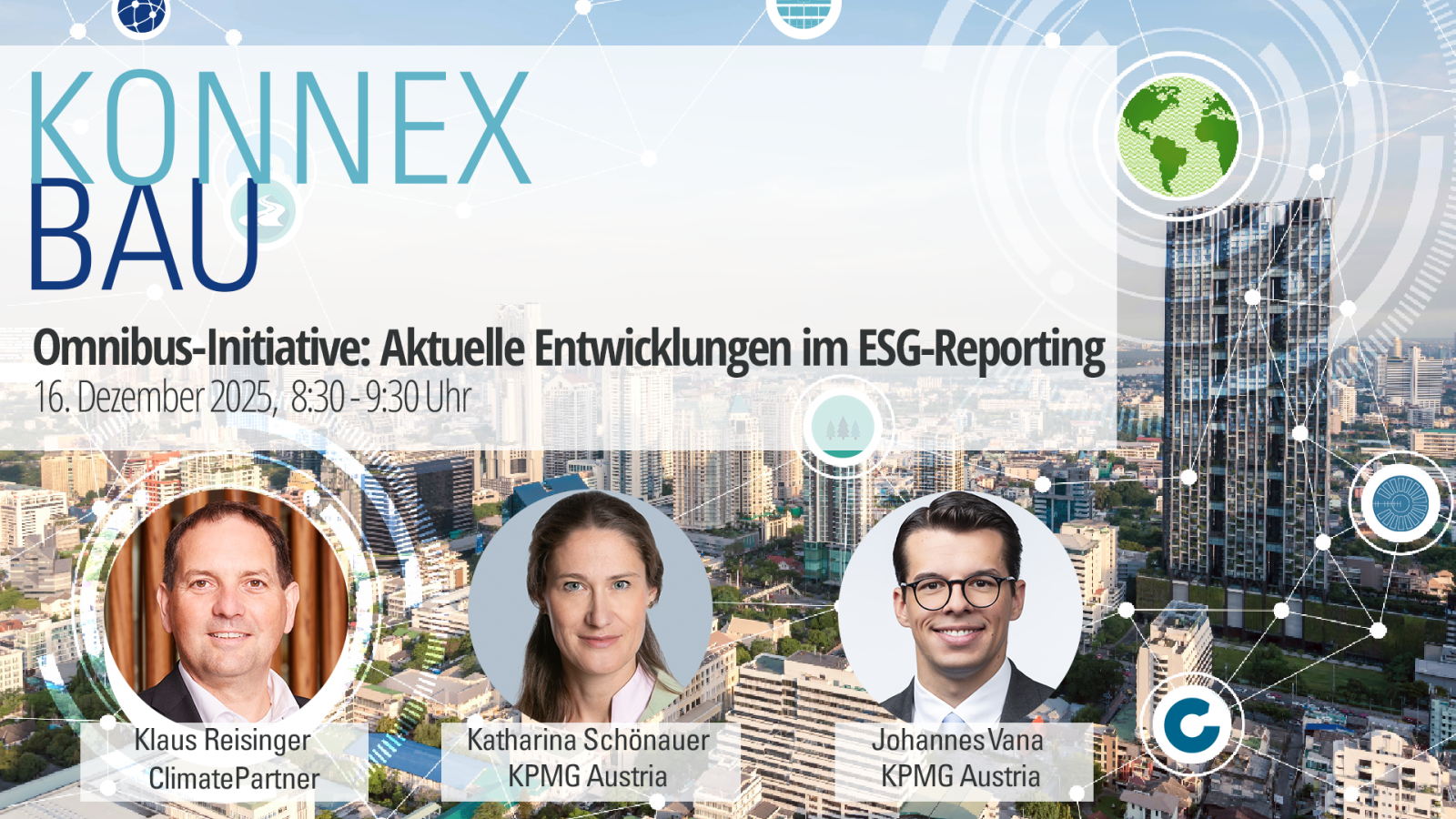Welche Auswirkungen haben die aktuellen Entwicklungen rund um die Omnibus-Initiative auf die Nachhaltigkeitsberichterstattung? Im nächsten Konnex Bau zum Thema „Omnibus-Initiative: Aktuelle Entwicklungen im ESG-Reporting“ wollen wir Ihnen einen Überblick rund um die aktuellen Ereignisse zum Omnibus und deren Auswirkung auf das ESG-Reporting geben.